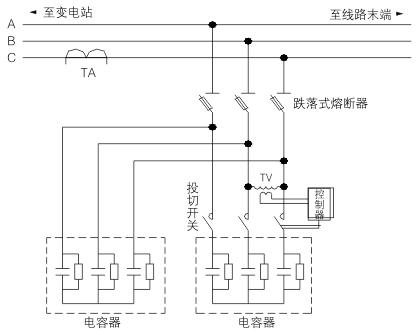 TBBZ系列高壓線路無功補償裝置主要由控制器,真空接觸器,電容器,電壓互感器,綜合保護器等組成。系統(tǒng)通過線路開啟式電流互感器采集線路電流信號,分析判斷線路無功功率缺失容量,控制電容器組的投切,使功率因數達到設定目標值。裝置采用戶外跌落式熔斷器對進行短路保護,一旦裝置有短路故障,跌落式熔斷器立即跳開,防止對裝置和線路造成損害。